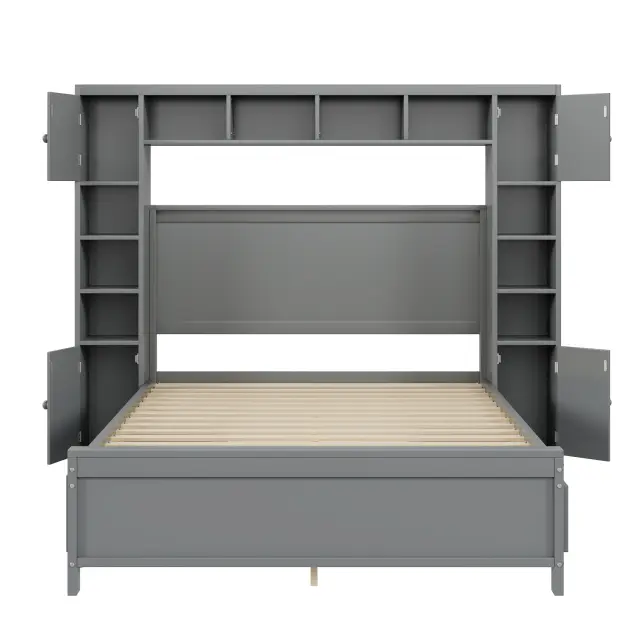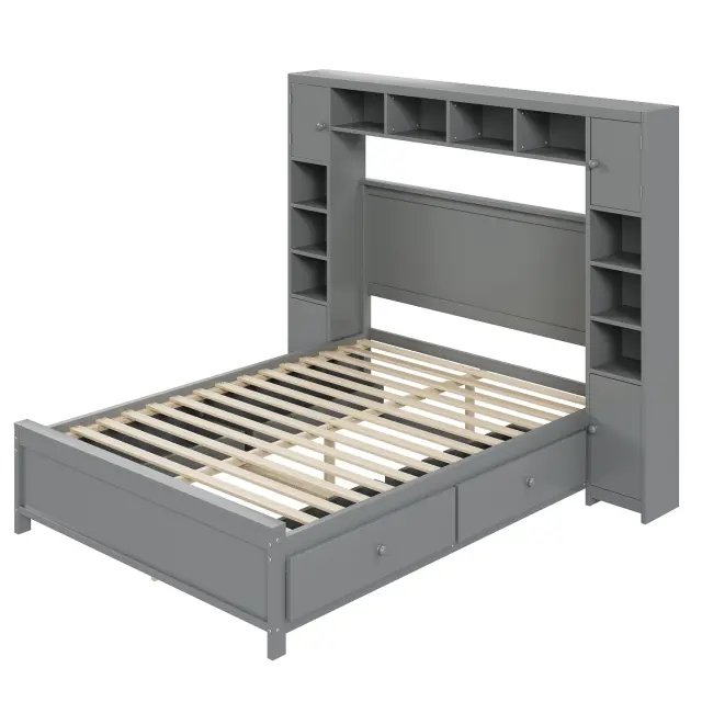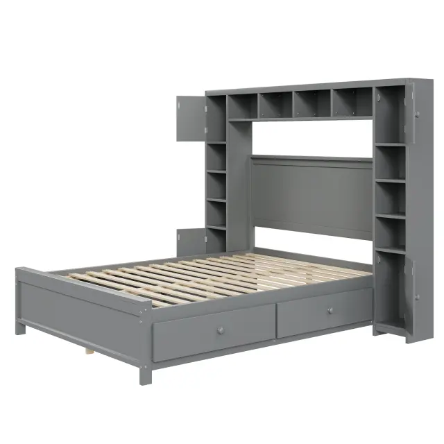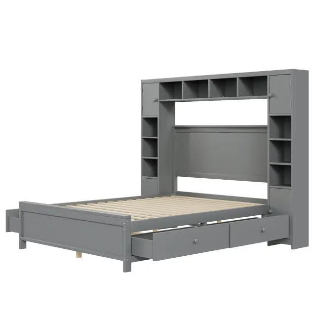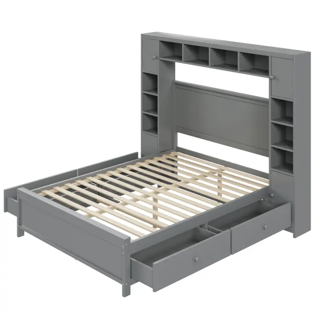 Okvir za zakonsko posteljo iz masivnega lesa s 4 predali in omarico, siv, 140x200