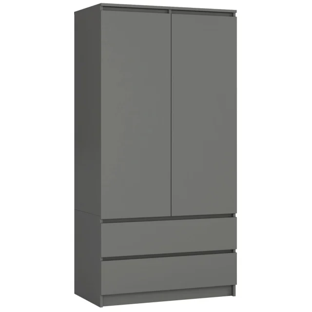 Omara z dvema vrati je izdelana iz abrazijsko odporne laminirane plošče. Telo pohištva je v celoti v grafitno sivi barvi. Spodnji del omare sestavljata dva predala, razporejena vzporedno drug nad drugim, medtem ko je zgornji, višji segment razdeljen na dva dela. Leva stran ima vrsto 4 polic, medtem ko je desna stran, opremljena s palico, namenjena obešanju oblačil.