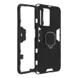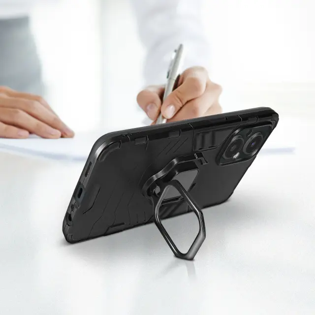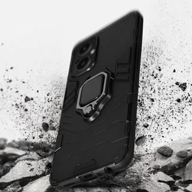 Oppo Reno 8 Lite 5G crno ohišje s kovinskim obrocem. Ta lupina iz dveh materialov iz polikarbonata in silikonskega gela je ucinkovita proti udarcem. Ima zadrževalni obroc s funkcijo podpore in je združljiv z magnetnimi nosilci.