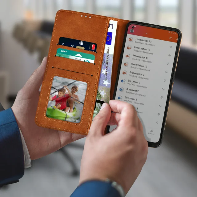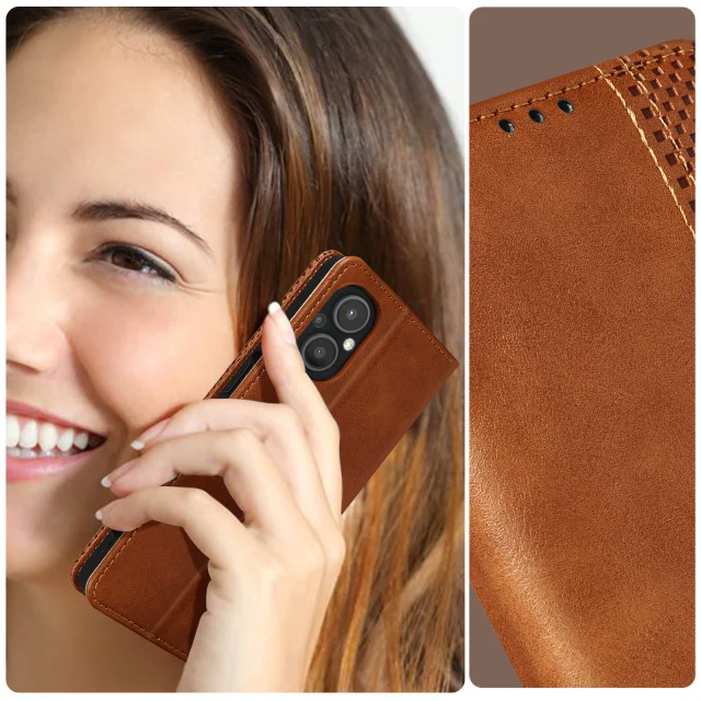 Oppo Reno 8 Lite 5G torbica z magnetom na preklop, držalo za kartice in video držalo - rjava