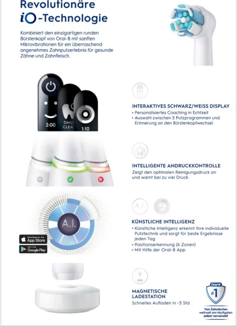 Najboljša čistilna moč Oral-B z revolucionarno magnetno iO tehnologijo za profesionalen, čist občutek in nežno izkušnjo čiščenja. Kombinira edinstveno okroglo glavo ščetke Oral-B z nežnimi mikrovibracijami za svež in čist občutek v ustih ter 100 % bolj zdrave dlesni v enem tednu v primerjavi s klasično ročno zobno ščetko. Interaktivni zaslon omogoča izbiro med različnimi programi čiščenja in vas opomni na zamenjavo nastavka - pozdravi vas ob vklopu ter vam nudi nasmeh za dobro čiščenje. Vgrajena umetna inteligenca prepozna vašo tehniko čiščenja in vam pomaga enakomerno očistiti vse zobe, pri tem pa ne pozabiti na nobeno območje. 5 programov čiščenja za osebno prilagojeno izkušnjo: Dnevno čiščenje, Občutljivo, Zaščita dlesni, Intenzivno čiščenje, Beljenje. Inteligentna kontrola pritiska z rdečo lučjo opozori ob premočnem pritisku, z belo ob premajhnem, z zeleno pa, ko uporabljate optimalen pritisk. Hitro in elegantno polnjenje s pomočjo magnetne postaje za polnjenje, ki omogoča hitro polnjenje v približno 3 urah. Vsebina: 1 ročaj, 2 nastavka, 1 potovalna torbica, 1 magnetna postaja za polnjenje, 1 mini-etui za nastavke.