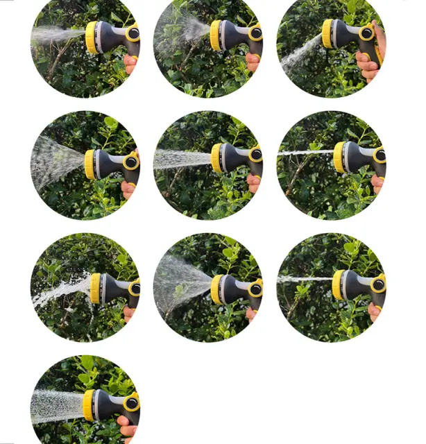 Vsestranski vzorci pršenja: Prilagodite se vsaki nalogi z nastavljivo šobo, ki ponuja različne vzorce pršenja, ki ustrezajo vašim specifičnim potrebam. Od nežnega pršenja za občutljive rastline do močnega curka za trdovratne madeže, ta vodna pištola zagotavlja prilagodljivost za opravljanje vseh opravil čiščenja ali zalivanja. Enostavno preklapljajte med vzorci s preprostim zasukom, kar zagotavlja optimalno porabo vode in učinkovitost za vsako uporabo okoli vašega doma in vrta.