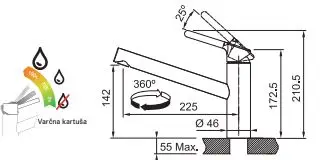 Model Armatura: kuhinjska armatura Izpust vode: s fiksnim izlivom z vrtenjem Vrsta perlatorja: laminarni Radij vrtenja: 360° Upravljanje armature: upravljanje od zgoraj Pretok vode: 11,9 l/min (3 bar) Povezovalne cevi: 450 mm