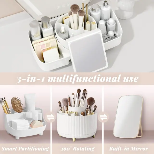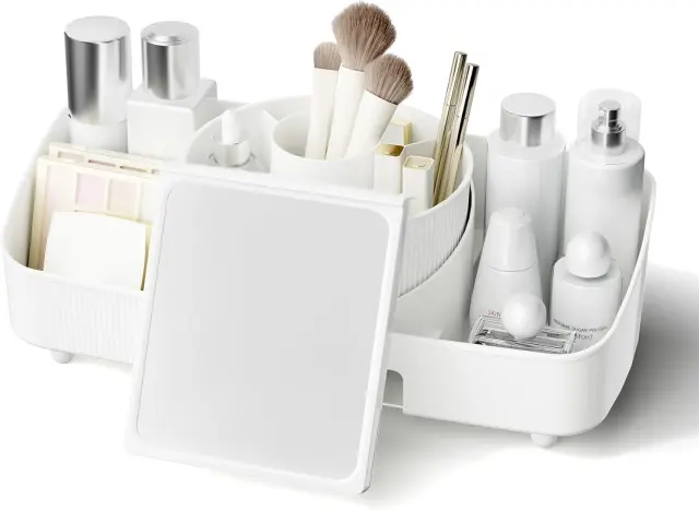Rotacijski organizator za ličila KOSEYA je zasnovan za vzpostavljanje reda in elegance na vaši toaletni mizici. Ta praktični pripomoček združuje funkcijo ogledala za ličenje in preglednega shranjevanja kozmetike, kar zagotavlja maksimalno funkcionalnost v enem izdelku. Njegova premišljena zasnova omogoča enostaven dostop do vseh pripomočkov, hkrati pa učinkovito prihrani prostor v vašem domu ali pisarni. Uporaba je povsem preprosta, saj vgrajeno ogledalo omogoča udobno nanašanje ličil neposredno ob mestu shranjevanja.