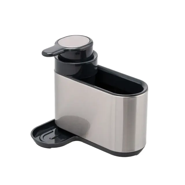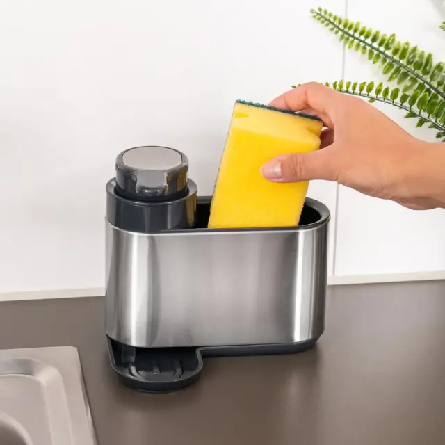 Eva dozirnik za detergent je lahko eleganten in funkcionalen dodatek na vašem pomivalnemu koritu. Izdelan je iz visokokakovostnega nerjavečega jekla 18/10, ki zagotavlja dolgo življenjsko dobo dozirnika in preprečuje morebitno korozijo. Moderen dizajn vključuje gladke linije in sijočo površino, ki se brez težav prilagaja različnim kuhinjskim slogom. Enostaven mehanizem doziranja (pritisk na gumb) omogoča enakomerno sproščanje detergenta, kar olajša pomivanje posode in ohranja vašo kuhinjo urejeno. Poleg dozirnika s prostornino 300 ml, je zraven predal za odlaganje, gobice, krtač ali ščetk. Pod dozirnikom je praktični lovilec kapljic, ki navadno pade iz dozirnika. Organizator za pomivalno korito očistite pod tekočo vodo. NAMIG: Lahko ga uporabite tudi v kopalnici.