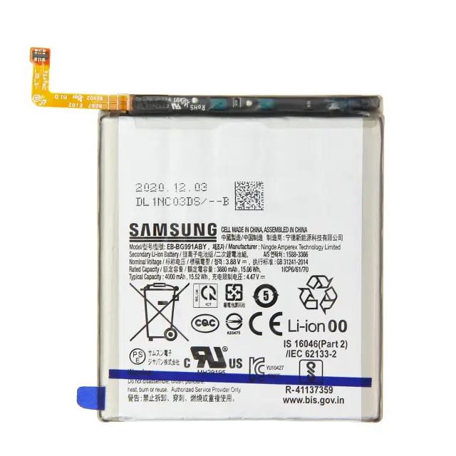 Originalna Samsung baterija EB-BG991ABY za Samsung Galaxy S21. Kapaciteta 4000 mAh, popolnoma enaka originalu. Servisni paket: 100 % original Samsung, pripravljen za namestitev. Povrnite začetno avtonomijo pametnega telefona in uživajte v vseh njegovih funkcijah.