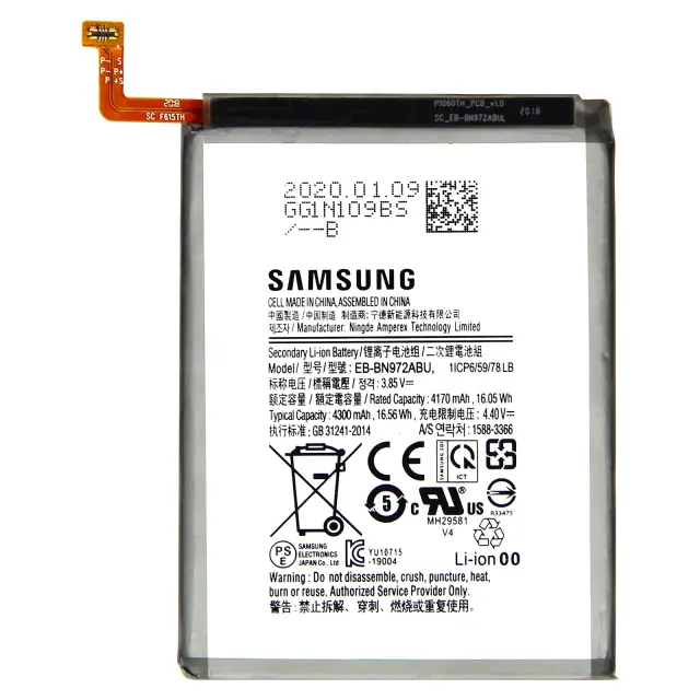 Originalna Samsung baterija EB-BN972ABU za Samsung Galaxy Note 10 Plus. Kapaciteta 4300 mAh, popolnoma enaka originalu. Servisni paket: 100 % original Samsung, pripravljen za namestitev. Povrnite začetno avtonomijo pametnega telefona in uživajte v vseh njegovih funkcijah.