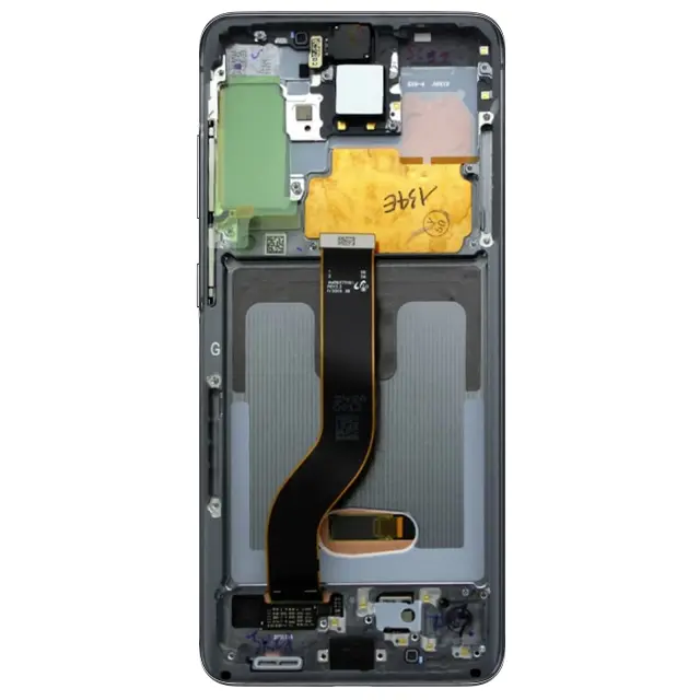 Original Samsung Galaxy S20 Plus LCD zaslon za zamenjavo vašega poškodovanega. Zaslon Samsung Galaxy S20 Plus z namešcenimi in integriranimi prikljucnimi kabli, pripravljen za namestitev. Celoten blok je 100 % združljiv za iskanje funkcije dotika.