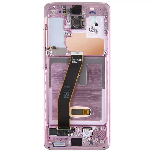 Original Samsung Galaxy S20 LCD zaslon za zamenjavo vašega poškodovanega. Zaslon Samsung Galaxy S20 z namešcenimi in integriranimi prikljucnimi kabli, pripravljen za namestitev. Celoten blok je 100 % združljiv za iskanje funkcije dotika.
