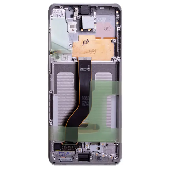 Original Samsung Galaxy S20 LCD zaslon za zamenjavo vašega poškodovanega. Zaslon Samsung Galaxy S20 z namešcenimi in integriranimi prikljucnimi kabli, pripravljen za namestitev. Celoten blok je 100 % združljiv za iskanje funkcije dotika.