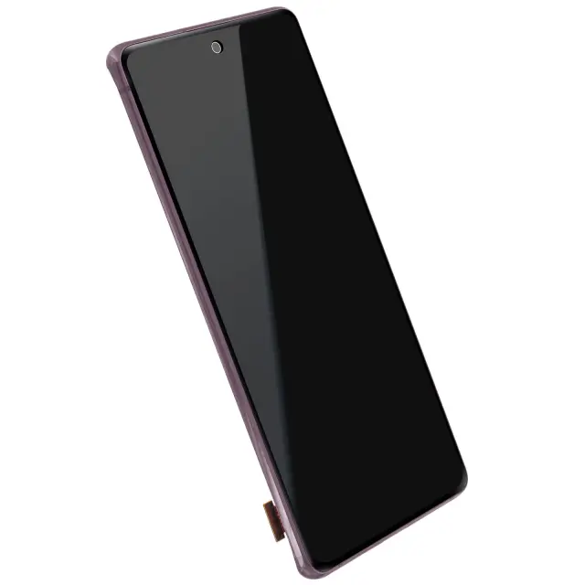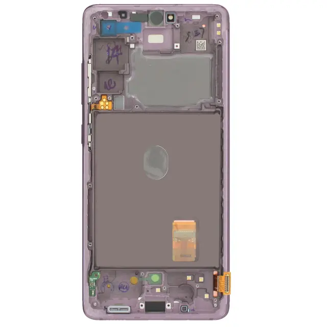 Original Samsung Galaxy S20 FE 5G LCD zaslon za zamenjavo vašega poškodovanega. Zaslon Samsung S20 FE 5G z namešcenimi in integriranimi prikljucnimi kabli, pripravljen za namestitev. Celoten blok je 100 % združljiv za iskanje funkcije dotika.