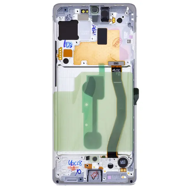 Original Samsung Galaxy S10 Lite LCD zaslon za zamenjavo vašega poškodovanega. Zaslon Samsung S10 Lite z namešcenimi in integriranimi povezovalnimi kabli, pripravljen za namestitev. Celoten blok je 100 % združljiv za iskanje funkcije dotika.