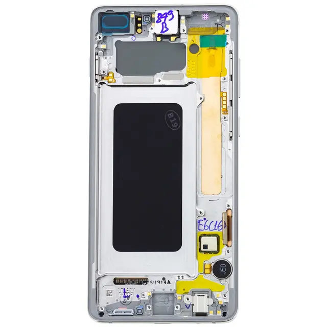 Original Samsung Galaxy S10 Plus LCD zaslon za zamenjavo vašega poškodovanega. Zaslon Samsung Galaxy S10 Plus z namešcenimi in integriranimi prikljucnimi kabli, pripravljen za namestitev. Celoten blok je 100 % združljiv za iskanje funkcije dotika.