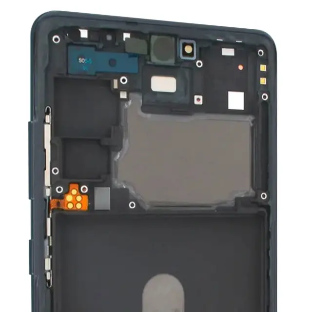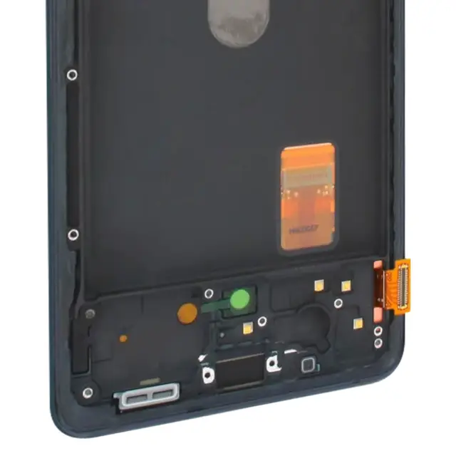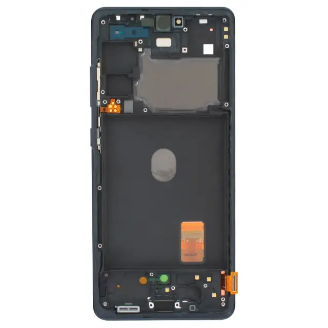 Original Samsung Galaxy S20 FE 4G LCD zaslon za zamenjavo vašega poškodovanega. Zaslon Samsung S20 FE 4G z namešcenimi in integriranimi prikljucnimi kabli, pripravljen za namestitev. Celoten blok je 100 % združljiv za iskanje funkcije dotika.