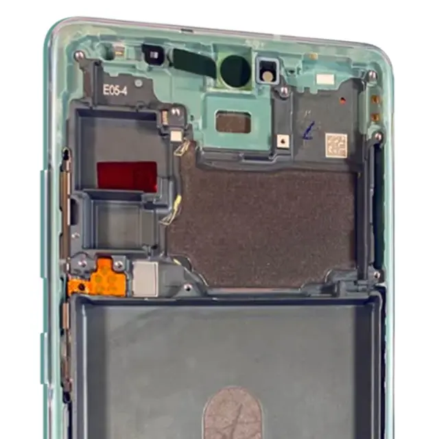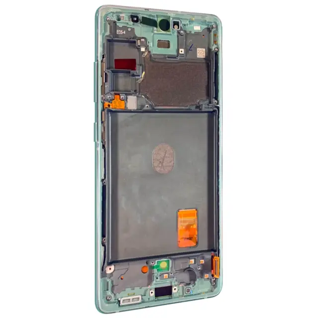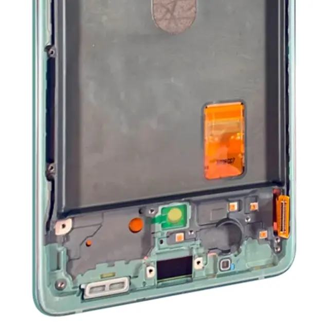 Original Samsung Galaxy S20 FE 4G LCD zaslon za zamenjavo vašega poškodovanega. Zaslon Samsung S20 FE 4G z namešcenimi in integriranimi prikljucnimi kabli, pripravljen za namestitev. Celoten blok je 100 % združljiv za iskanje funkcije dotika.