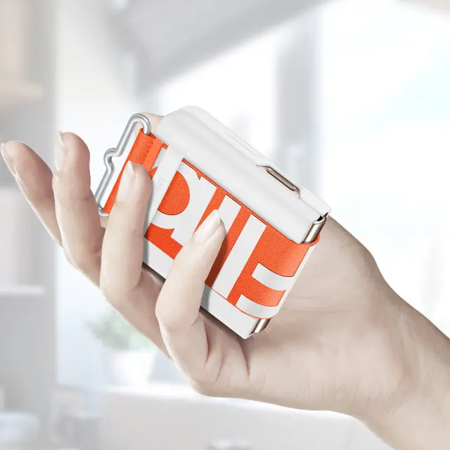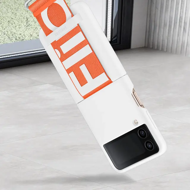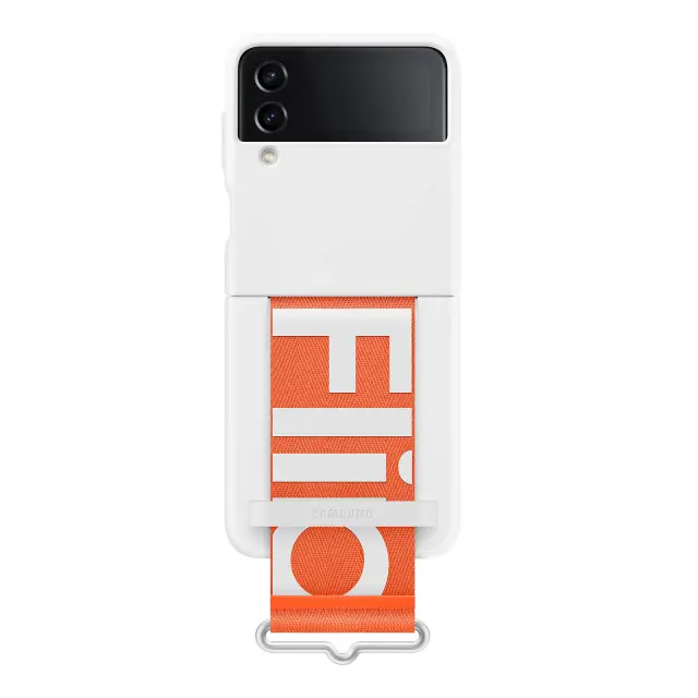 Uradna zaščitna in trendovska bela torbica za Samsung Galaxy Z Flip 4. Na torbici je prisoten trak, da je vedno pri roki za varno uporabo. Zagotavlja optimalno zaščito pred udarci in udarci. Njegova mehka silikonska prevleka se prilega eleganci vašega telefona.