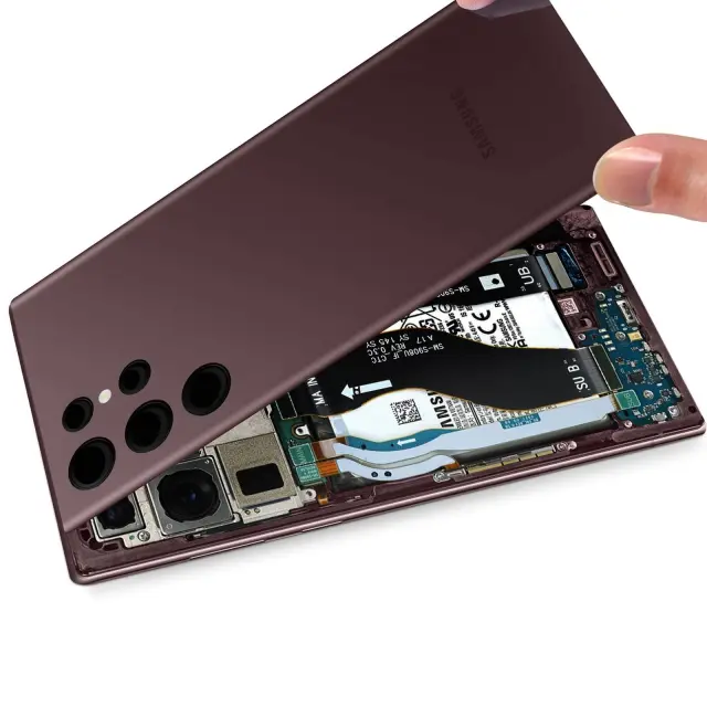 Originalni bordo pokrovcek baterije Samsung Galaxy S22 Ultra za zamenjavo obrabljenega ali zlomljenega zadnjega pokrova vašega mobilnega telefona. Zadnji pokrov identicen originalu z zašcitnim objektivom kamere in bliskavice.