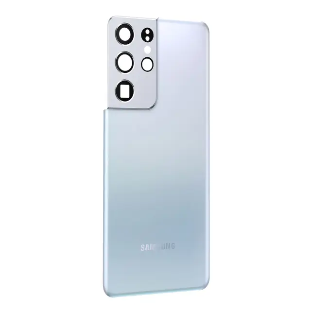 Originalni pokrov baterije za Samsung Galaxy S21 Ultra, ki nadomesti obrabljen zadnji pokrov vašega mobilnega telefona. Uradni pokrov baterije za Samsung S21 Ultra identicen originalu in z izrezi na kameri in bliskavici. Prisoten je tudi logotip.