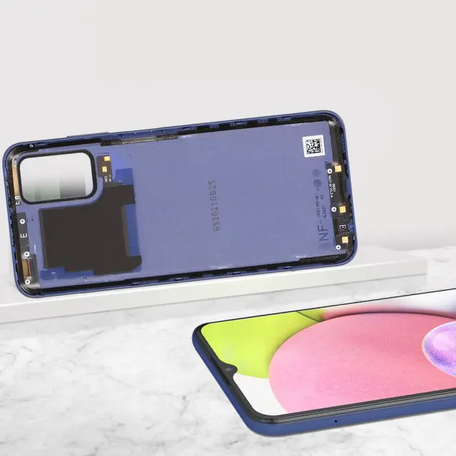 Originalni pokrov baterije za Samsung Galaxy A03s, ki nadomesti obrabljen zadnji pokrov vašega mobilnega telefona. Pokrov baterije identicen originalu, z izrezi na kameri in bliskavici.
