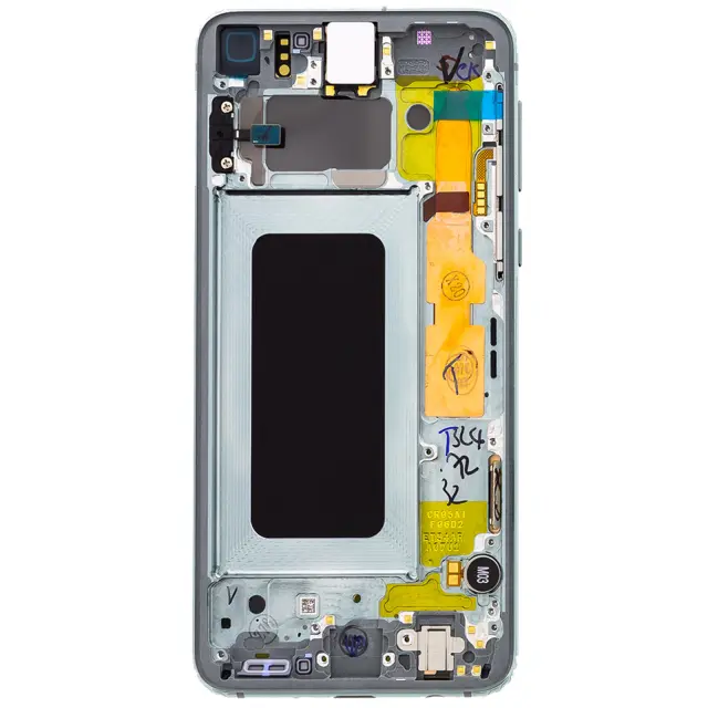 Original Samsung Galaxy S10e LCD zaslon za zamenjavo vašega poškodovanega. Zaslon Samsung Galaxy S10e z namešcenimi in integriranimi prikljucnimi kabli, pripravljen za namestitev. Celoten blok je 100 % združljiv za iskanje funkcije dotika.