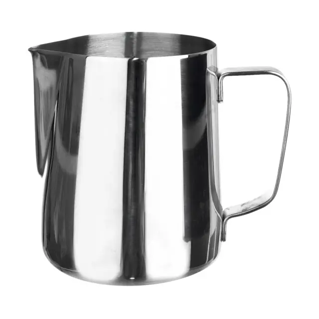 Jeklen vrč, ki se lahko uporablja kot vrč za mleko za serviranje toplega mleka za kavo in za penjenje mleka v aparatih za espresso, opremljenih s parno šobo. Kot vemo, je najbolje mleko speniti v kovinskem vrču z ustreznim nastavkom, da dobimo dobro konsistenco mleka in ga lahko lepo in lepo vlijemo v kavo. Vrč ima izliv, zasnovan za latte art, popoln za penjenje mleka in pripravo kapučina.