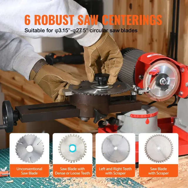• Učinkovito ostrenje rezil: 370W ostrilnik krožnih žag s hitrostjo 3600RPM zagotavlja hitro in natančno ostrenje, kar pušča rezila ostre in brez bur.