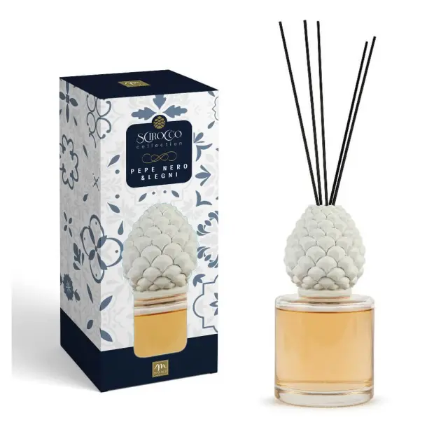 Osvežilec zraka s palčkami Scirocco Pepe Nero & Legni s prostornino 500 ml, navdušuje z izrazito in elegantno dišavo, kjer se pikantne note črnega popra prepletajo z bogatim, toplim vonjem lesa. Ta prefinjena kombinacija ustvari dinamično, a hkrati umirjeno vzdušje, ki prostoru doda karakter in prefinjenost. Dišava se postopoma sprošča skozi elegantne črne palčke, ki prostor napolnijo z dolgotrajnim in prijetnim vonjem. Steklenička s keramičnim okrasnim pokrovom v obliki rumenega storža ni le funkcionalna, temveč tudi estetsko dovršena dekoracija za vsak dom. Difuzor je idealna izbira za ustvarjanje sproščujočega vzdušja v dnevni sobi, spalnici ali kot izbrano darilo za posebne priložnosti.