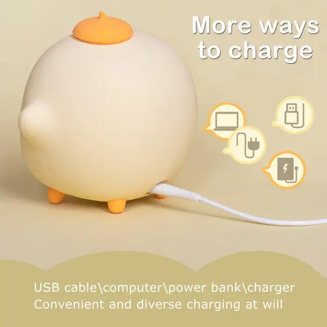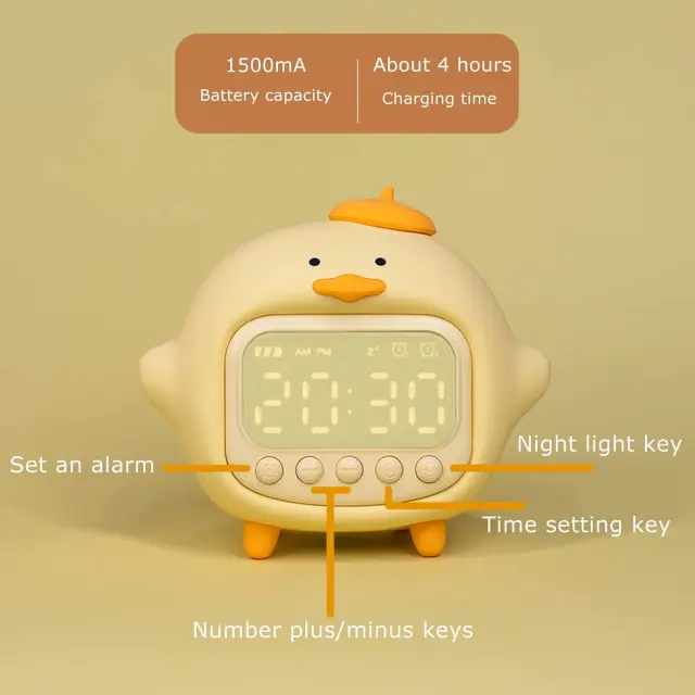 [Nastavljiv način osvetlitve] Svetlost svetlobe te račje budilke je mogoče poljubno prilagoditi. Svetloba je mehka in udobna, ne bo poškodovala vaših oči in lahko bolje zadovolji vaše različne potrebe. Ta svetilka vam bo prinesla tudi drugačno izkušnjo.2 načina budilke in 5-minutni način dremeža: Budilka raca ima 5 budilk, ki jih lahko izberete poljubno, vsak dan pa vas bodo zbujali različni zvoki budilke. Budilko lahko izklopite, ko je izklopljena, na voljo pa je tudi enominutni način dremeža, ki vas udobno zbudi. Intimen dizajn: Ta budilka je izdelana iz mehkega silikonskega materiala, tako da se lahko vaš dojenček brezskrbno igra. LED zaslon je jasen, številke so jasne, ne bodo poškodovale vaših oči, informacije pa so jasno prikazane na prvi pogled. Večnamenski način polnjenja: Budilka uporablja 15 mAh baterijo velike zmogljivosti z daljšo življenjsko dobo baterije. Budilka podpira dostop prek kabla USB, podpira pa tudi načine polnjenja računalnika in mobilnega telefona. Priročna, prenosna in jo je mogoče poljubno polniti. Uporaba v več prizorih: ta nočna lučka budilke je primerna za različne prizore. Lahko je tvoja igrača. Ko berete knjigo, jo lahko uporabite za navdih ali opomin, da ne zamudite časa. Lahko se uporablja tudi kot dekoracija namizja med delom, da vaš delovni proces ne bo dolgočasen.