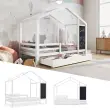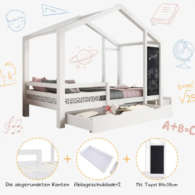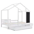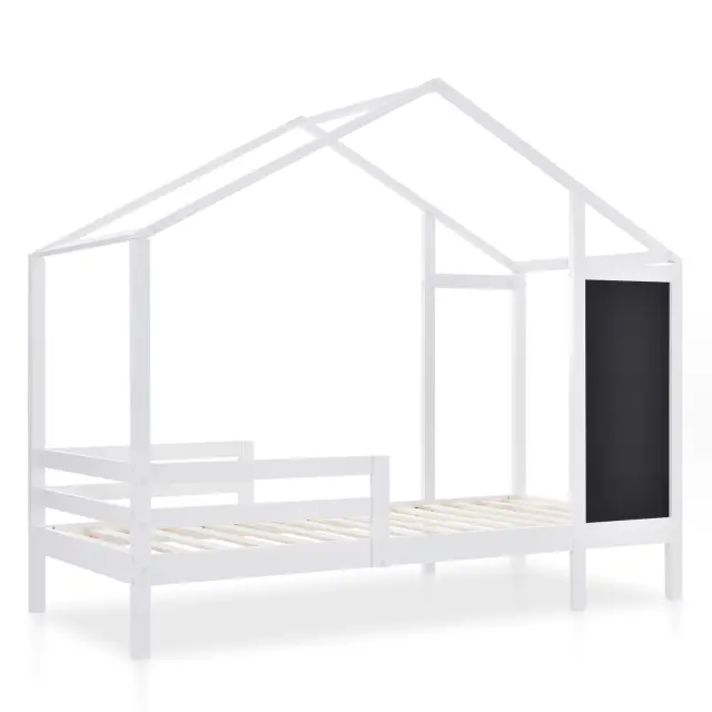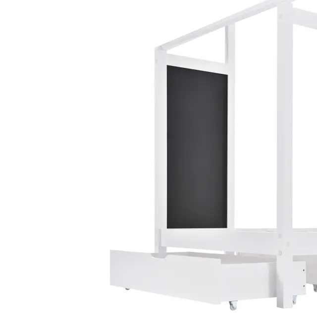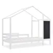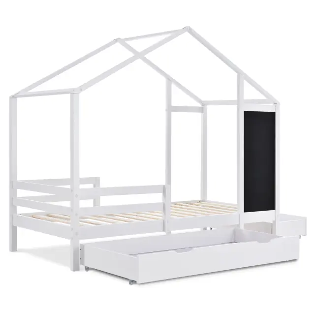 Otroška hišna postelja 90x200cm, masivni les s tablo, 2 predala, ograja, bela (brez vzmetnice)