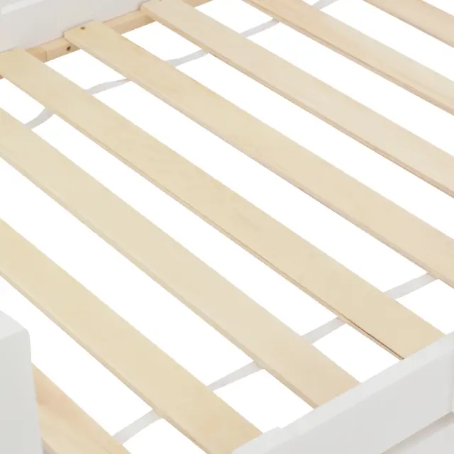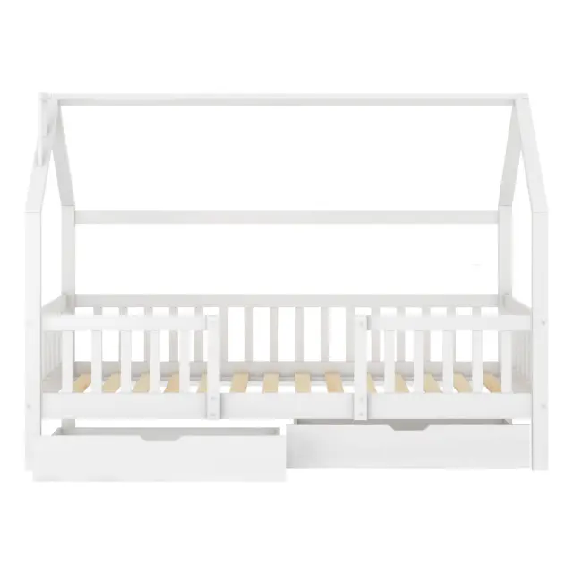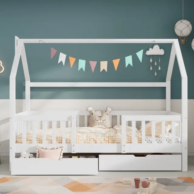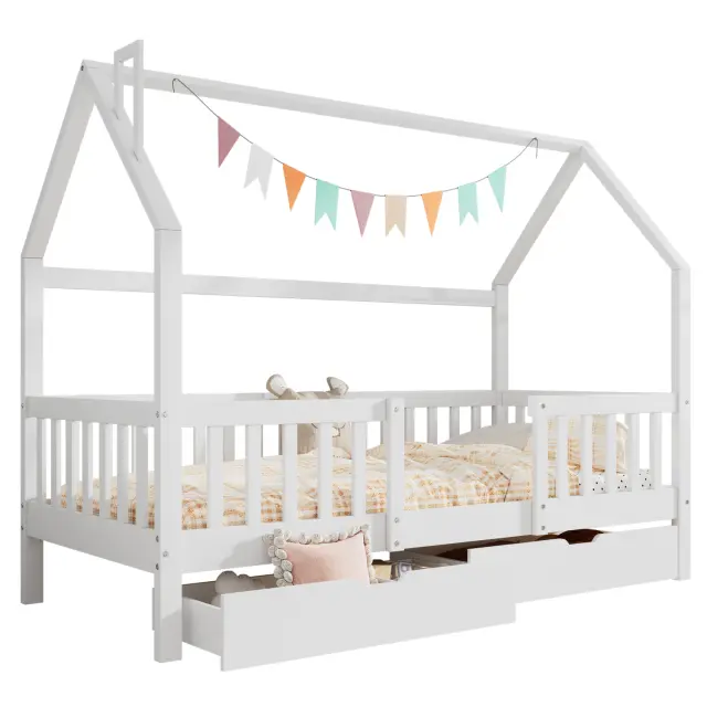 Otroška hišna postelja s kaminom, 2 predala, borov les, 90x200 cm, bela