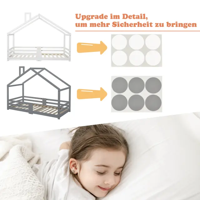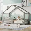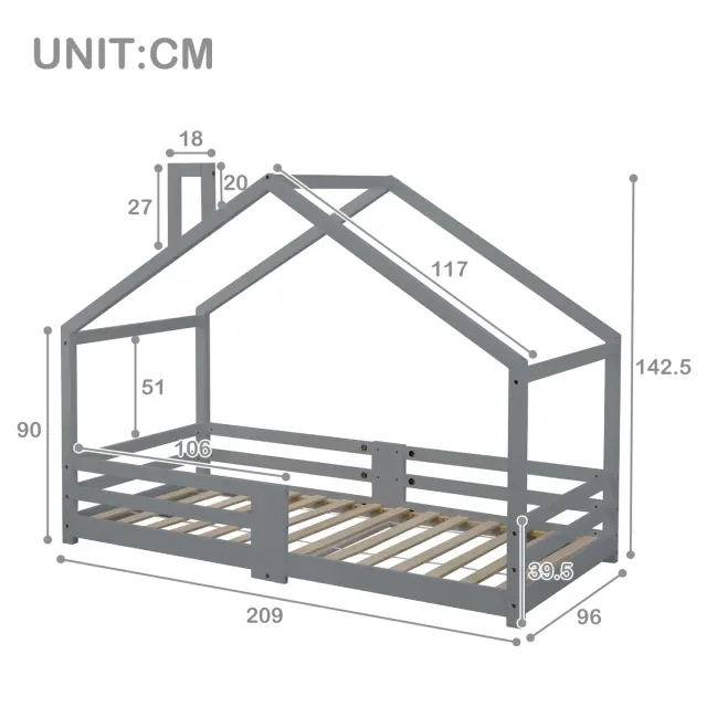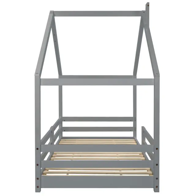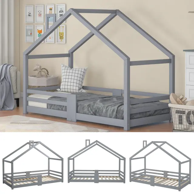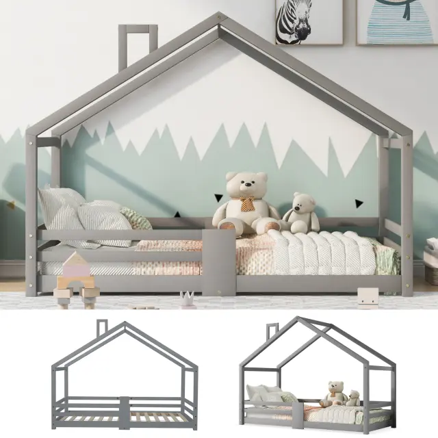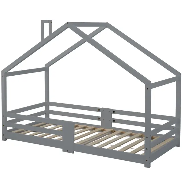 Otroška hišna postelja s kaminom, zaščita pred padci, borov les, 90x200 cm, siva (brez vzmetnice)