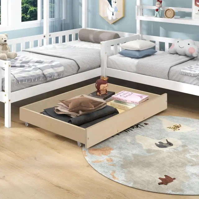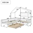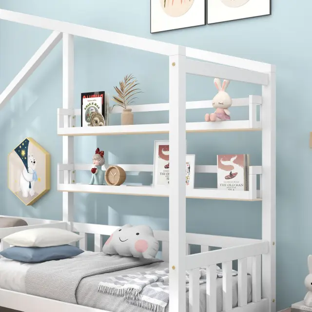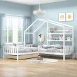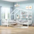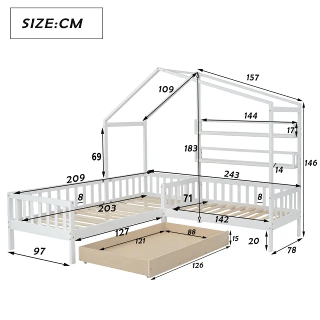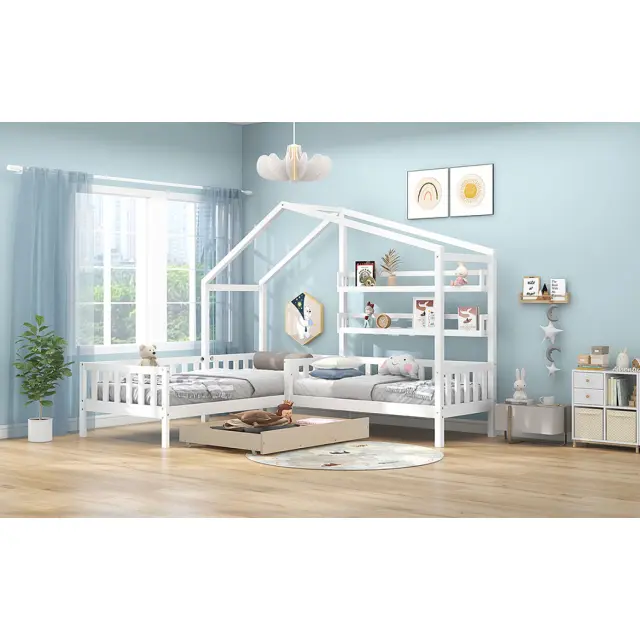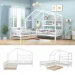 Otroška hišna postelja s predali, policami, masiven les, ograja, letveni okvir, L-struktura, bela (90x200cm+140x70cm)