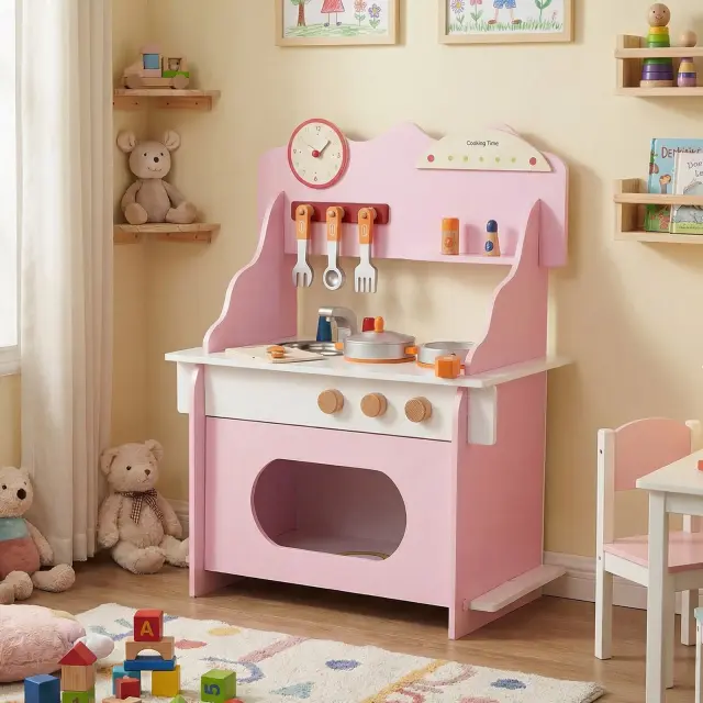 Spodbudite otrokovo domišljijo s to čudovito oblikovano leseno kuhinjo! Ta komplet z realističnimi podrobnostmi, kot so dvojna kuhalna plošča, vrtljivi gumbi, pomivalno korito, pečica in ura, vsako igro spremeni v interaktivno kuharsko pustolovščino. Izdelan je iz visokokakovostnih materialov in ob upoštevanju strogih varnostnih standardov, zato zagotavlja brezskrbno zabavo za mlade kuharje. Vključeno je vse, kar vaš otrok potrebuje: 12 realističnih dodatkov, veliko prostora za shranjevanje in pametna organizacija - za manj nereda in več ustvarjalnosti.