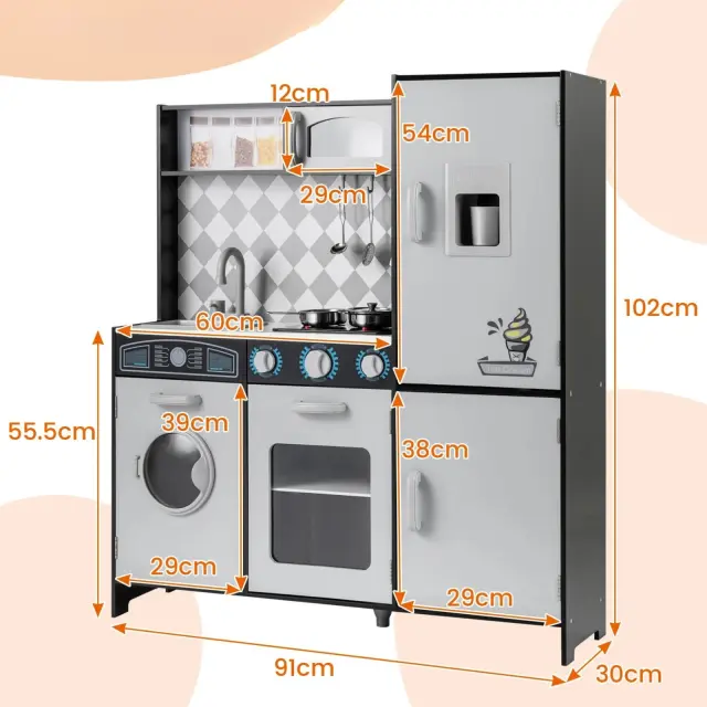 Odlično darilo za otroke: Ta leseni igralni kuhinjski set meri 91 x 30 x 102 cm (d x š x v) in je idealen za otroke, stare 3 leta in več. Zasnovan je tako, da z interaktivno igro spodbuja otroške hobije, izboljšuje fine motorične spretnosti, krepi jezikovne spretnosti in socialne stike.