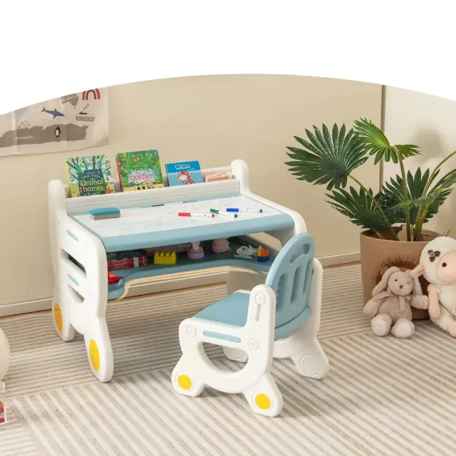 Večnamenski komplet pisalne mize in stola za otroke: Komplet pisalne mize z ergonomskim stolom pomaga otrokom razviti dobre navade sedenja. Poleg risanja lahko otroci po potrebi delajo domače naloge, berejo, se igrajo z igračami ali jedo. Poleg tega je prikupen videz zelo privlačen za otroke, stare od 3 do 8 let.