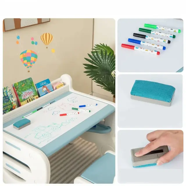 Visokokakovostni materiali so gladko polirani, da zaščitijo občutljivo otroško kožo. Poleg tega trdna trapezoidna struktura prispeva k splošni stabilnosti. Nedrseče podloge za noge pa ne povečujejo le stabilnosti, temveč tudi preprečujejo praske na tleh. Ta komplet risalne mize za otroke je opremljen tudi z grafitarsko mizno ploščo za brisanje, priloženi pa so tudi akvarelni svinčniki in radirke, da lahko otroci rišejo po lastni želji. Komplet mize in stolov za malčke je primeren tudi za učenje, igro in prehranjevanje. Vgrajeni prostor za shranjevanje pa ponuja prostor za vse, vključno s knjigami, pisalnimi potrebščinami, igračami itd. Ko ga ne potrebujete več, lahko stol shranite pod mizo in tako prihranite prostor.