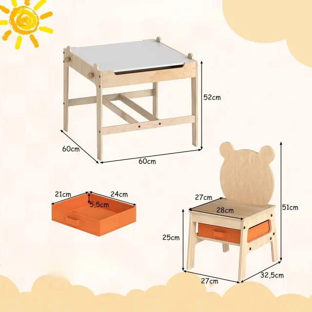 Odkrijte svet ustvarjalnosti in zabave z našo vsestransko otroško mizo z dvema stoloma. Obojestranska mizna plošča omogoča preklapljanje med gladko belo in klasično črno tablo. Pod mizo je velik, skrit predal za shranjevanje igrač, materialov za ustvarjanje in knjig, ki poskrbi za urejenost igralnega prostora. Poleg tega 2 odstranljiva in zložljiva predala iz blaga zagotavljata dodaten prostor za shranjevanje. 2 masivni leseni palici v mizi služita kot držala za zvitke papirja in praktični kljukici.