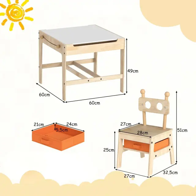 Odkrijte svet ustvarjalnosti in zabave z našo vsestransko otroško mizo z dvema stoloma. Obojestranska mizna plošča omogoča preklapljanje med gladko belo in klasično črno tablo. Pod mizo je velik, skrit predal za shranjevanje igrač, materialov za ustvarjanje in knjig, ki poskrbi za urejenost igralnega prostora. Poleg tega 2 odstranljiva in zložljiva predala iz blaga zagotavljata dodaten prostor za shranjevanje. 2 masivni leseni palici v mizi služita kot držala za zvitke papirja in praktični kljukici.