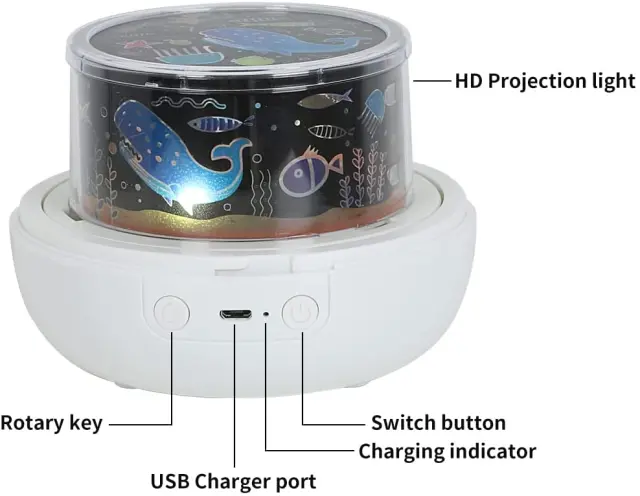 Otroška nočna lučka, 360° zvezdna projektorska svetilka s 6 projekcijami in 5 glasbami, glasbena nočna lučka USB, okrasna lučka za otroško sobo,