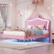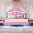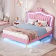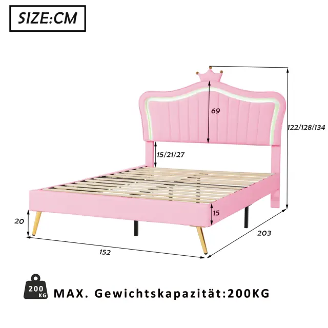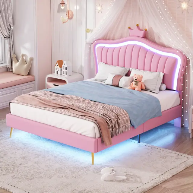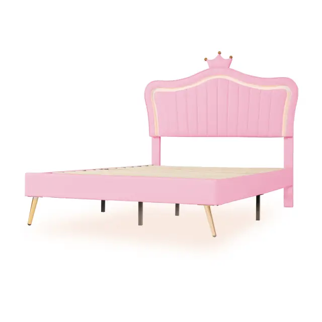 Otroška oblazinjena postelja 140x200cm, roza krona, okvir za zakonsko posteljo iz umetnega usnja z LED lučkami in vzglavjem.