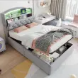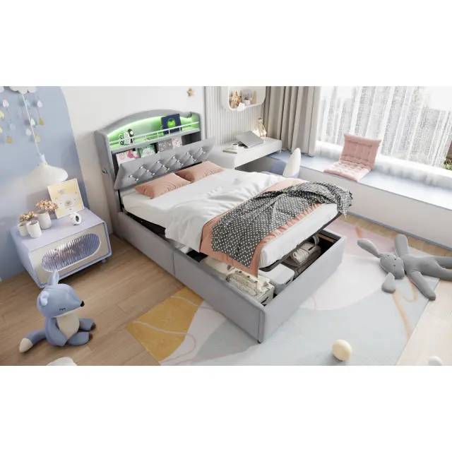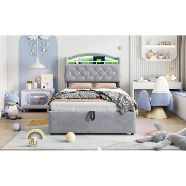 Otroška oblazinjena postelja 90x200 žametna enojna postelja s prostorom za shranjevanje, LED in USB siva