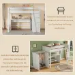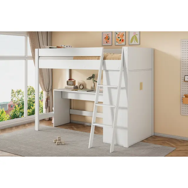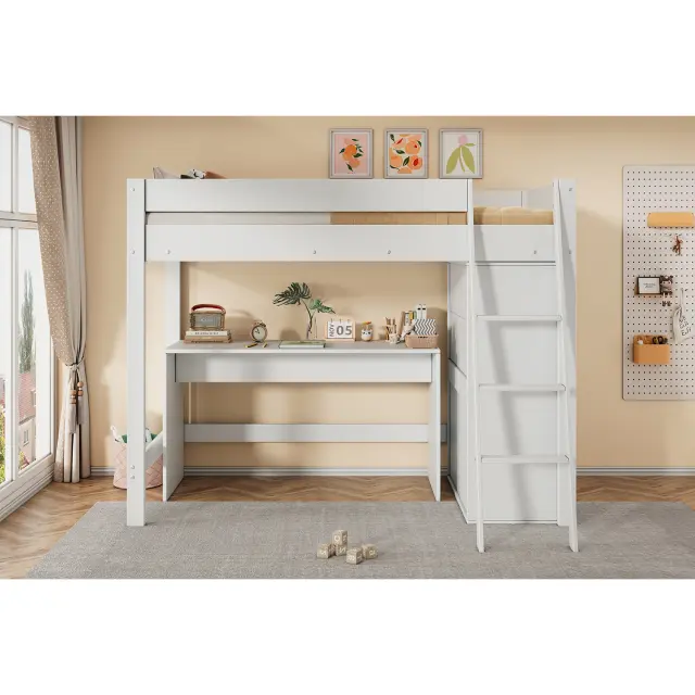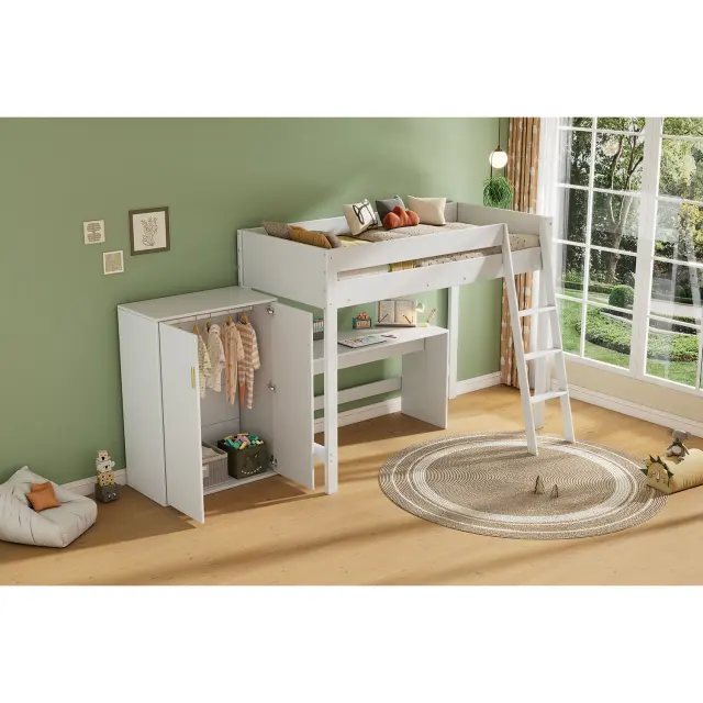 Ta masivna lesena podstrešna postelja ima vgrajeno omaro in pisalno mizo, kar zagotavlja veliko prostora za shranjevanje in namensko delovno površino za učenje. Zaradi bele barve in varnostnih ograj je praktična in elegantna izbira za otroke.