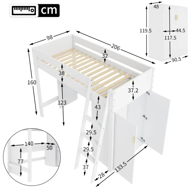 Otroška podstrešna postelja z lestvijo, mizo in omaro, bela 90x200