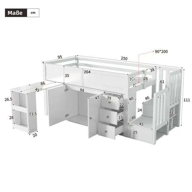 Ta postelja dimenzij 90 x 200 cm ponuja veliko prostora za shranjevanje z mizo, omarami in predali. Trdna konstrukcija iz MDF materiala podpira do 136 kg. Varnostne ograje in stabilne stopnice zagotavljajo varnost vašega otroka.