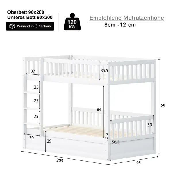 Ta masivna lesena pogradna postelja (200 x 90 cm) maksimalno izkoristi prostor z vgrajenim hidravličnim shranjevanjem, varnostnimi ograjami in robustno konstrukcijo.