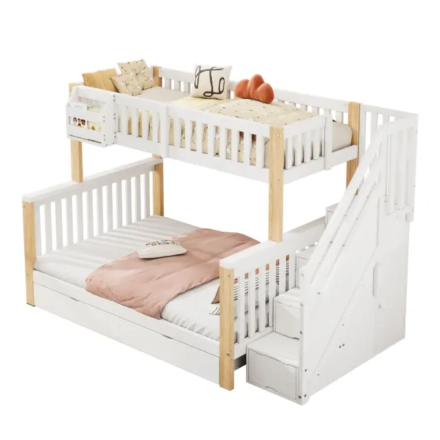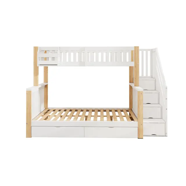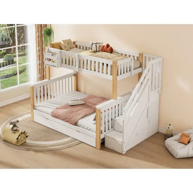 Vrsta letvičastega ogrodja: Vključeno Vrsta vzmetnice: Ni vključeno Podrobnosti: Prostori za shranjevanje: Predali za shranjevanje, košare za shranjevanje, shramba za stopnice, omare za shranjevanje Opomba: Dimenzije: Vse dimenzije so približne Največja nosilnost: Zgornja in spodnja postelja lahko preneseta obremenitev 120 kg (264 lbs) Prevleka: Masivni les + MDF