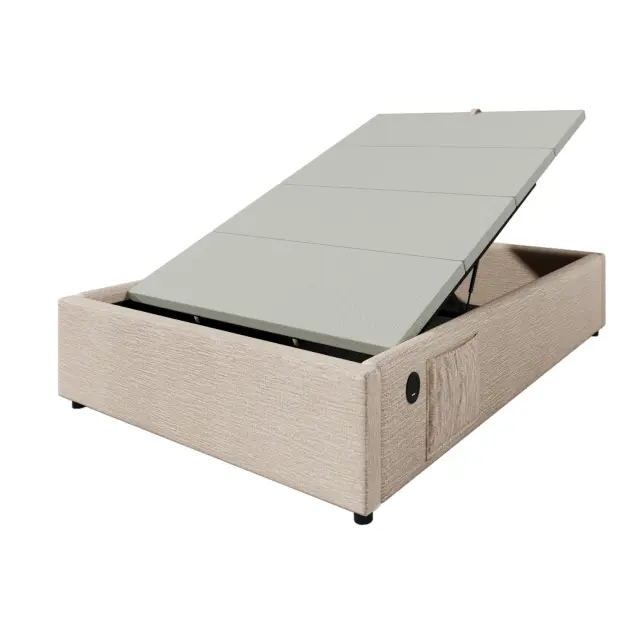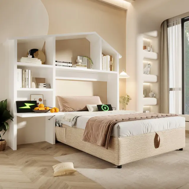 Otroška postelja 90x200 cm s polico, prostorom za shranjevanje in USB-C priključkom, naravna.