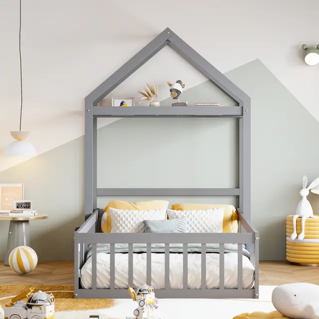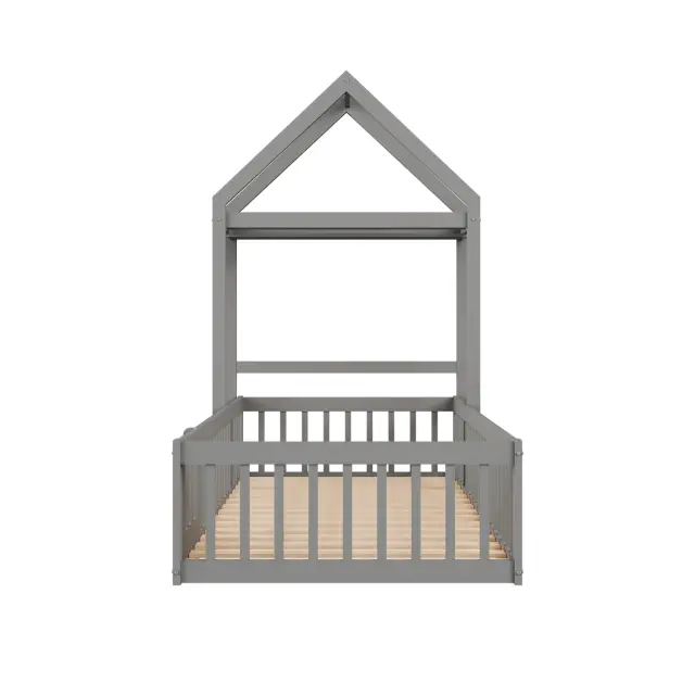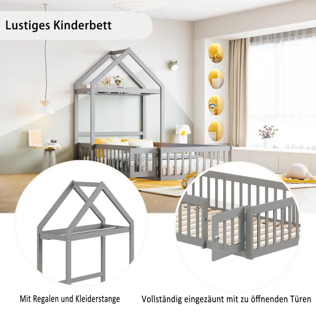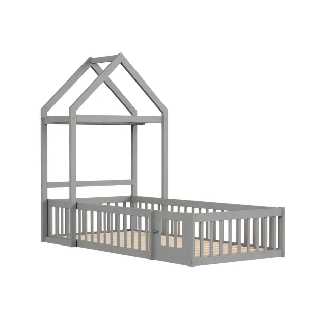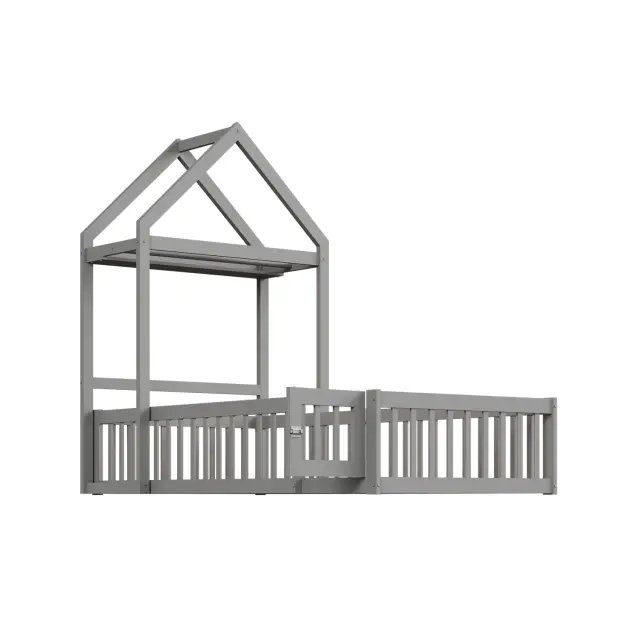 Otroška postelja 90x200 iz masivnega lesa s prostorom za shranjevanje, varnostno ograjo, vrati, siva