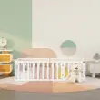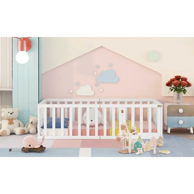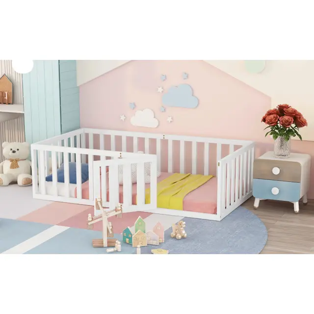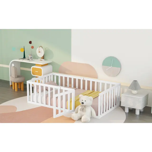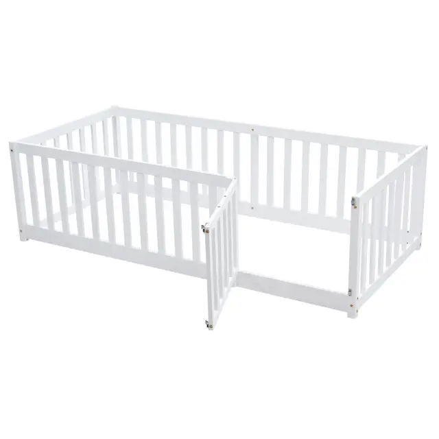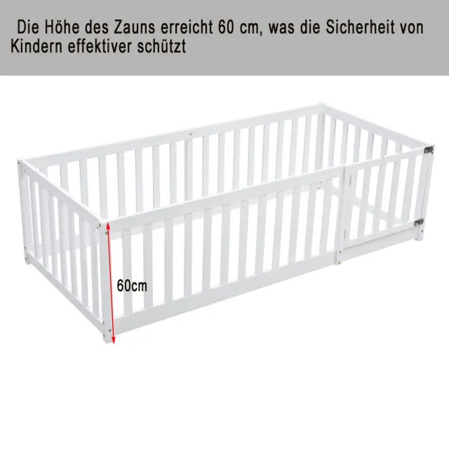 Otroška postelja 90x200, lesen okvir z ograjo in vrati, bela
