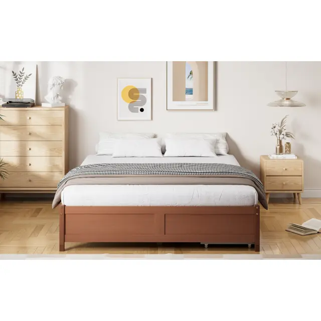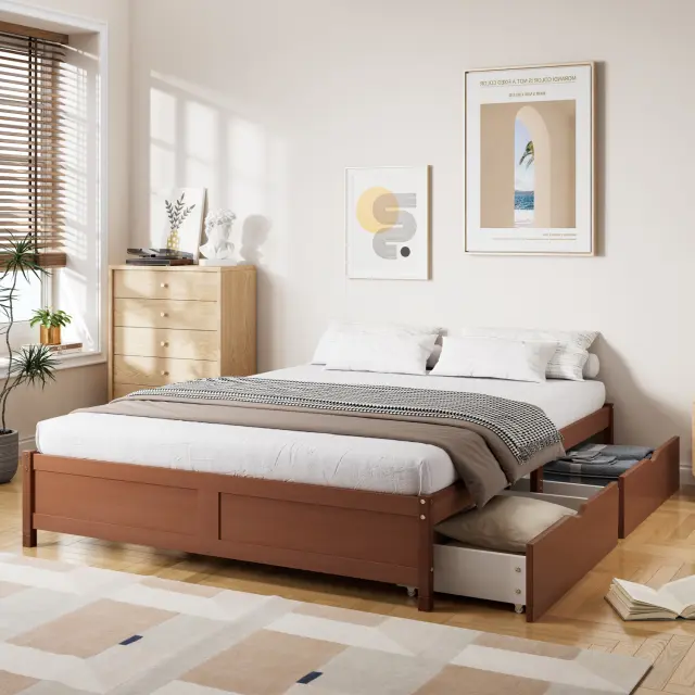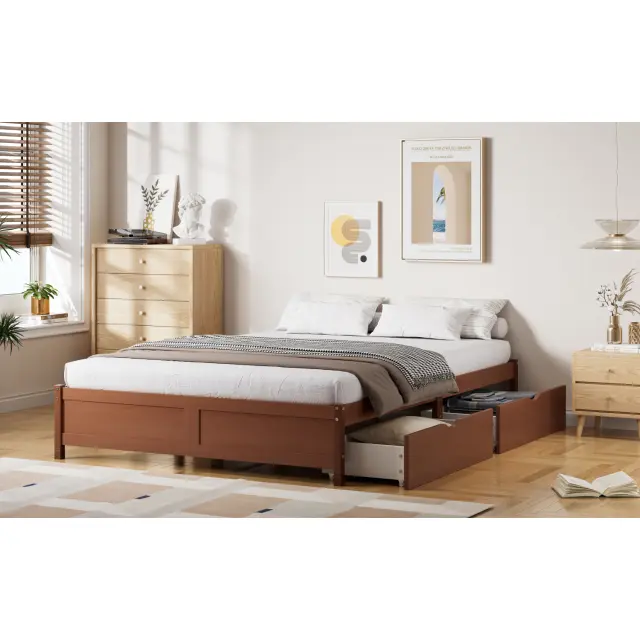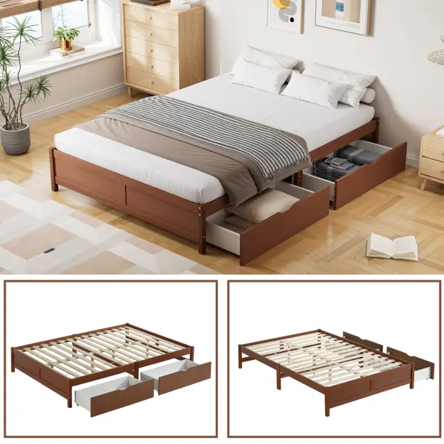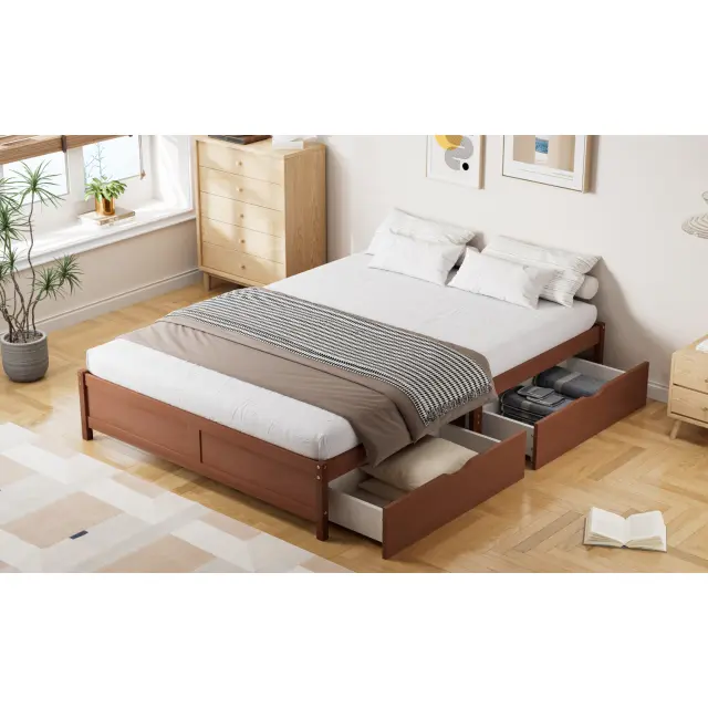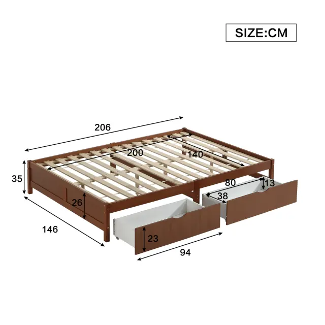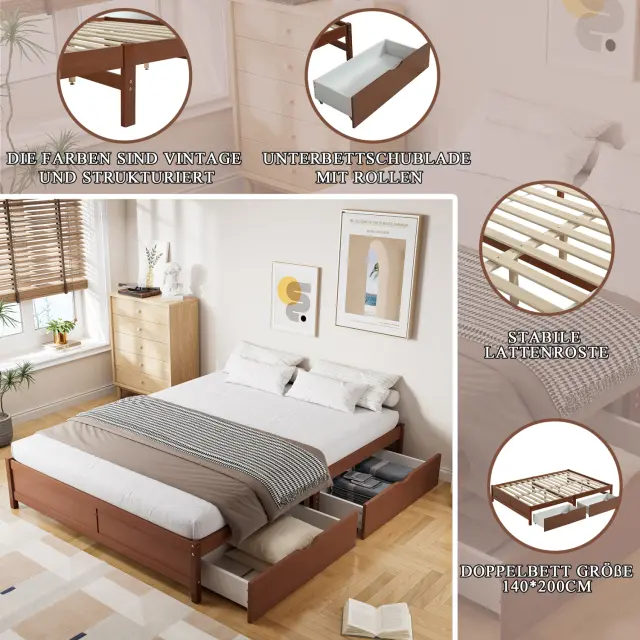 Otroška postelja iz masivnega borovega lesa, 140x200cm, z 2 predaloma, vintage rdečkasto rjava